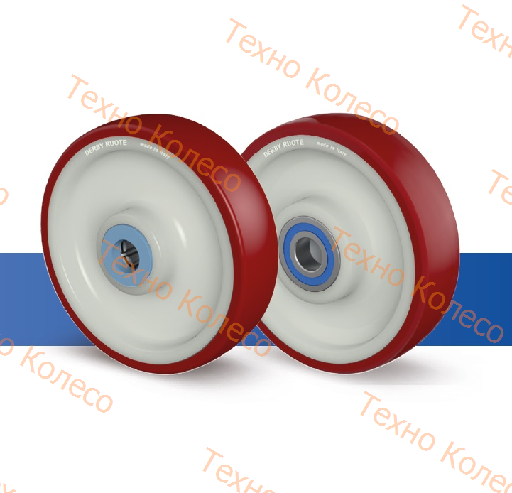 Основание колес из полиамида, контактный слой из литого под давлением полиуретана красного цвета(твердость 95 Шор А). Игольчатый подшипник из нержавеющей стали в ступице колеса.