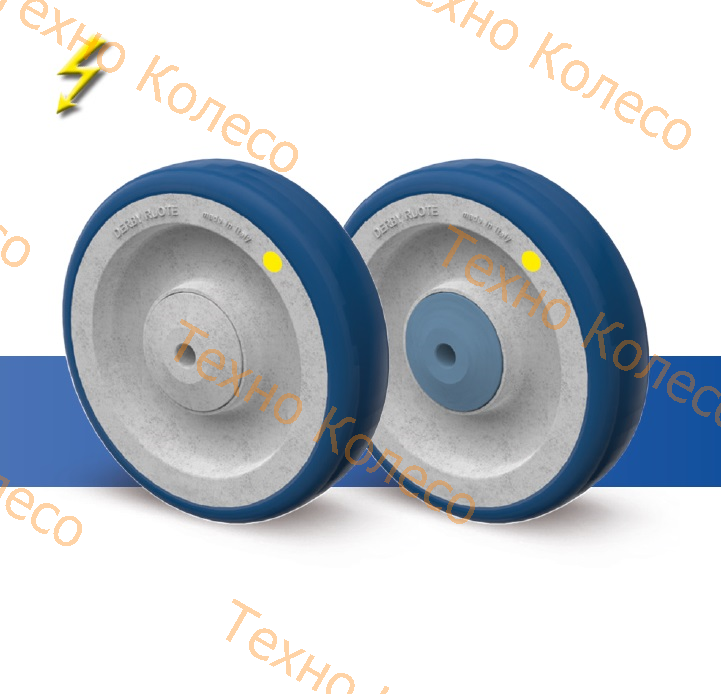 Основание колес из электропроводящего полиамида, контактный слой из литого под давлением электропроводящего мягкого полиуретана голубого цвета (твердость 80 Шор А).