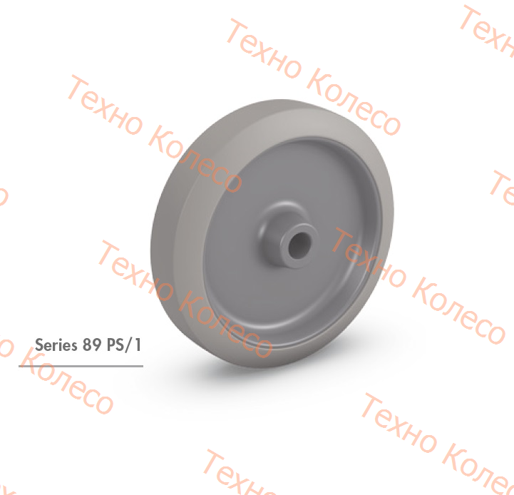 Промышленные колеса серии 89 PS/1. Основание колес литое из полиамида, контактный слой из термопластичного резинового эластомера, втулка скольжения в ступице колеса (/1). Возможно исполнение колес с роликовым подшипником (/3) и нержавеющим роликовым подшипником (/3R).