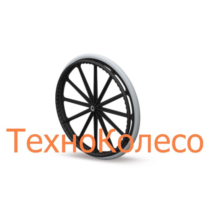 Колеса для реабилитационной техники серии RG-RF-RS. Основание колес из полиамида, прецизионные шариковые подшипники в ступице колеса. Контактный слой из не оставляющей следов термопластичной серой резины (RG), либо полиуретановой резины (RF), твердость 65 Шор А.