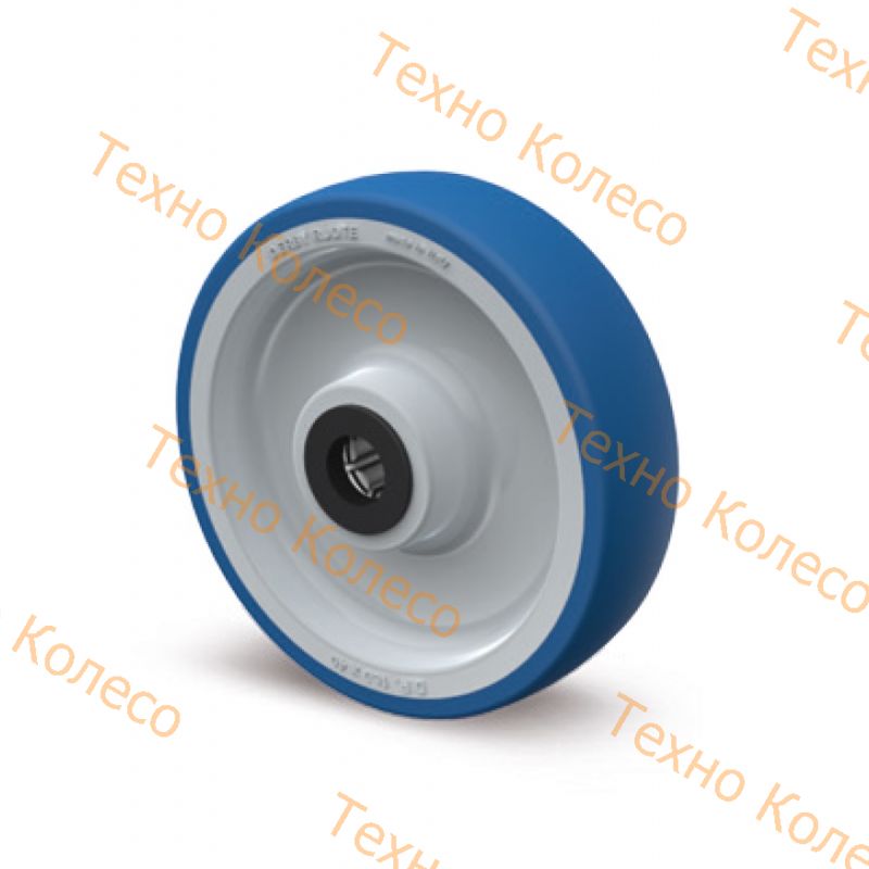 колесо серии NPR 80Sha - Основание колес из полиамида, контактный слой из мягкого полиуретана голубого цвета (твердость 80 Шор А). Игольчатый подшипник в ступице колеса.