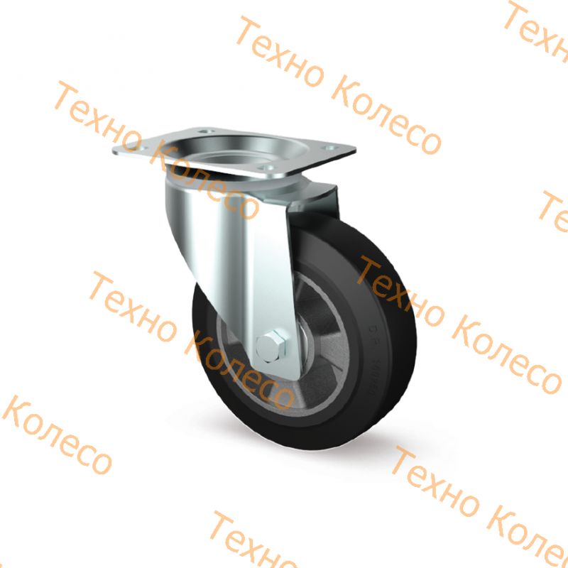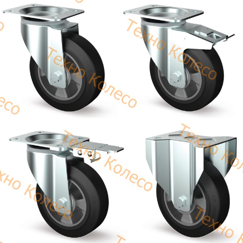 Основание колеса из алюминия,контактный слой из черной эластичной резины (твердость 68 Шор А). Прецизионные шариковые подшипники в ступице колеса