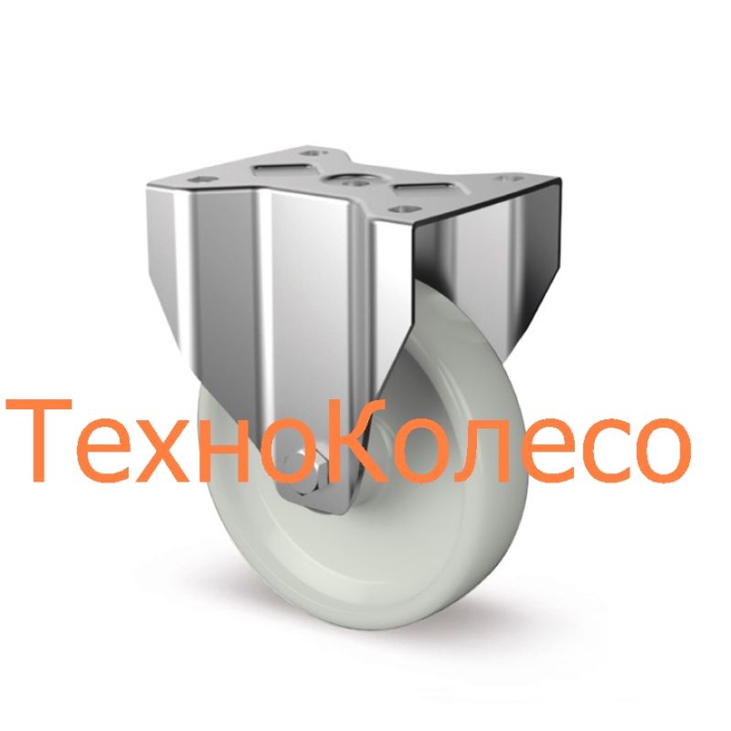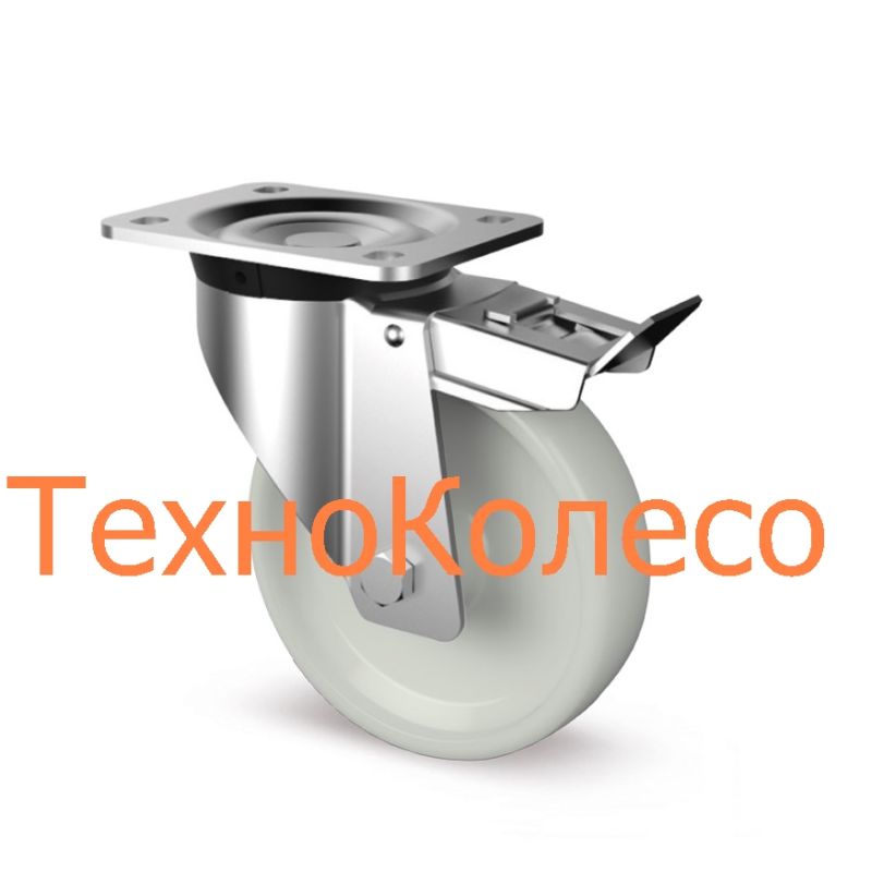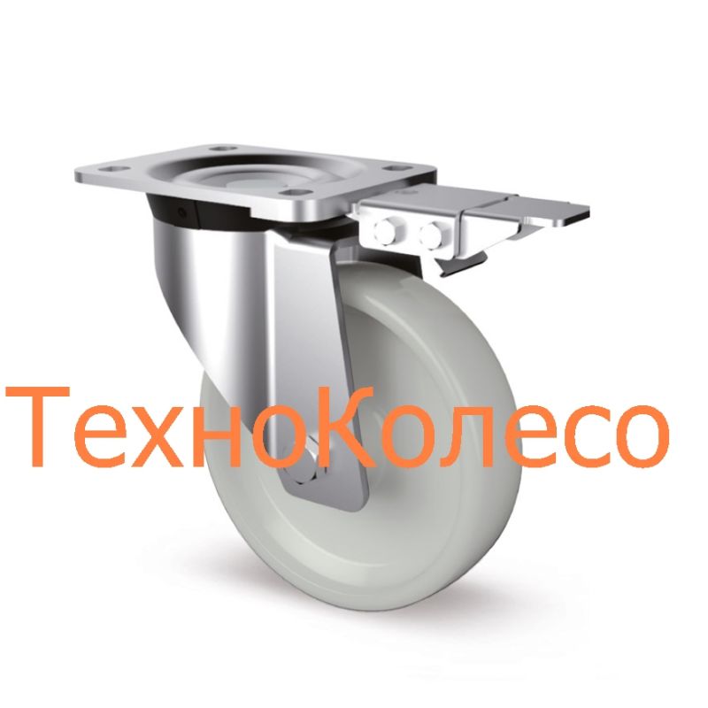 Колеса из полиамида (твердость 75 Шор D), кронштейны из штампованной нержавеющей стали, двойной шариковый подшипник в поворотном узле, поворотный узел усилен и скреплен центральной заклепкой.